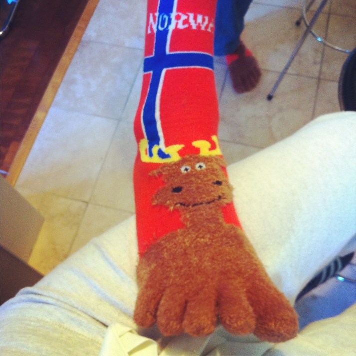 Beau went to Norway and got himself these super creepy but cute but awesome all at the same time socks. I’m super jelly. OMG so creepy! but sooo adorable! Beau’s got hairy hobbit feet. ha. eww. Share this: Click to share on Facebook (Opens in new window) Facebook Click to share on Pinterest (Opens in new window) Pinterest Click to share on X (Opens in new window) X Click to email a link to a friend (Opens in new window) Email Like Loading... Related