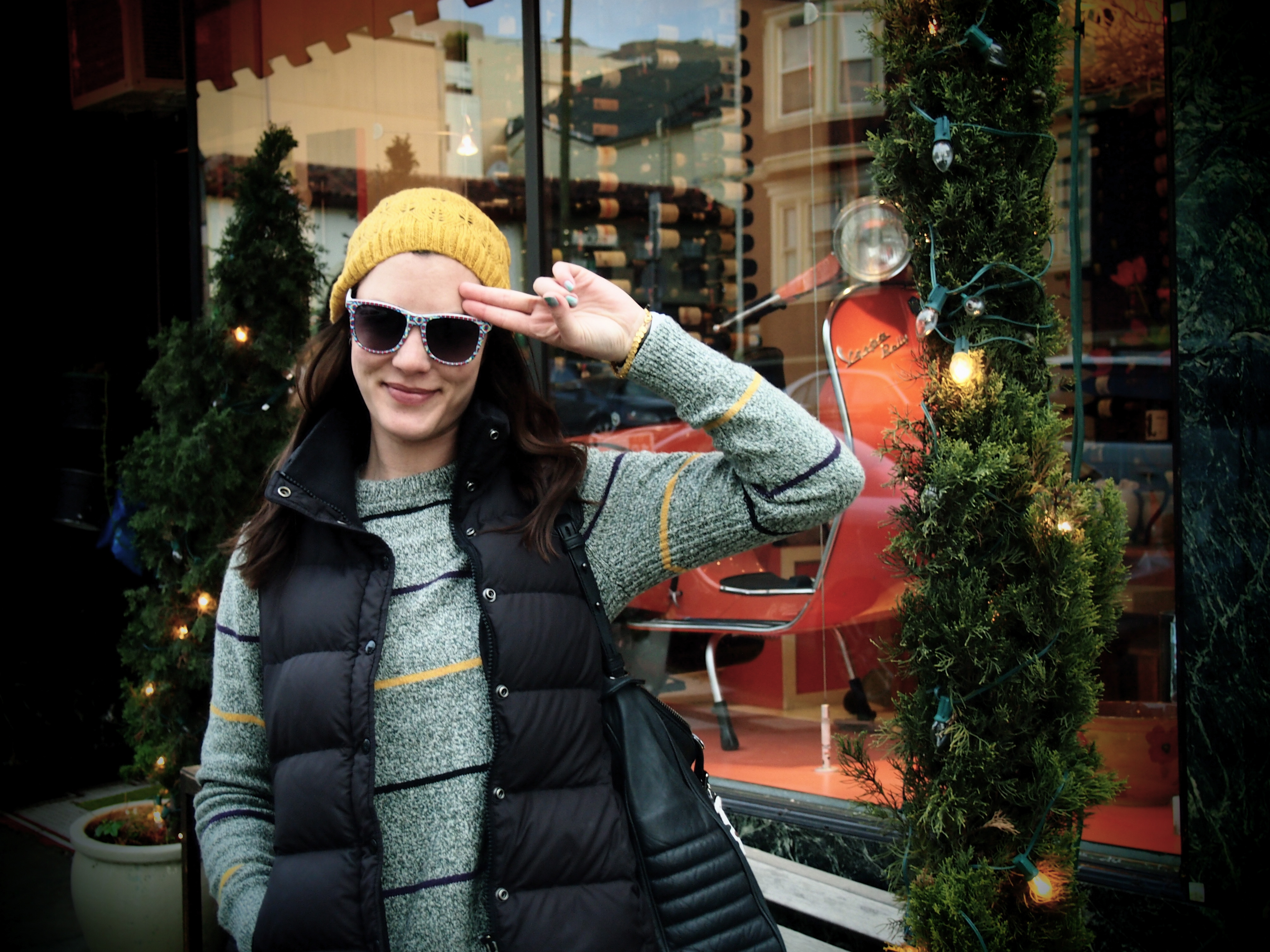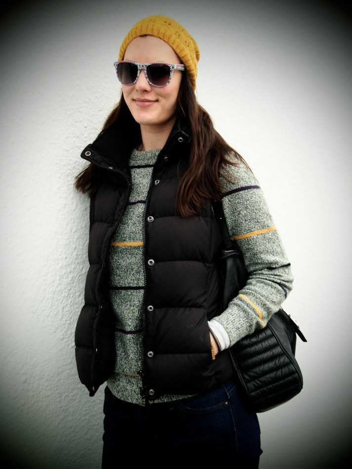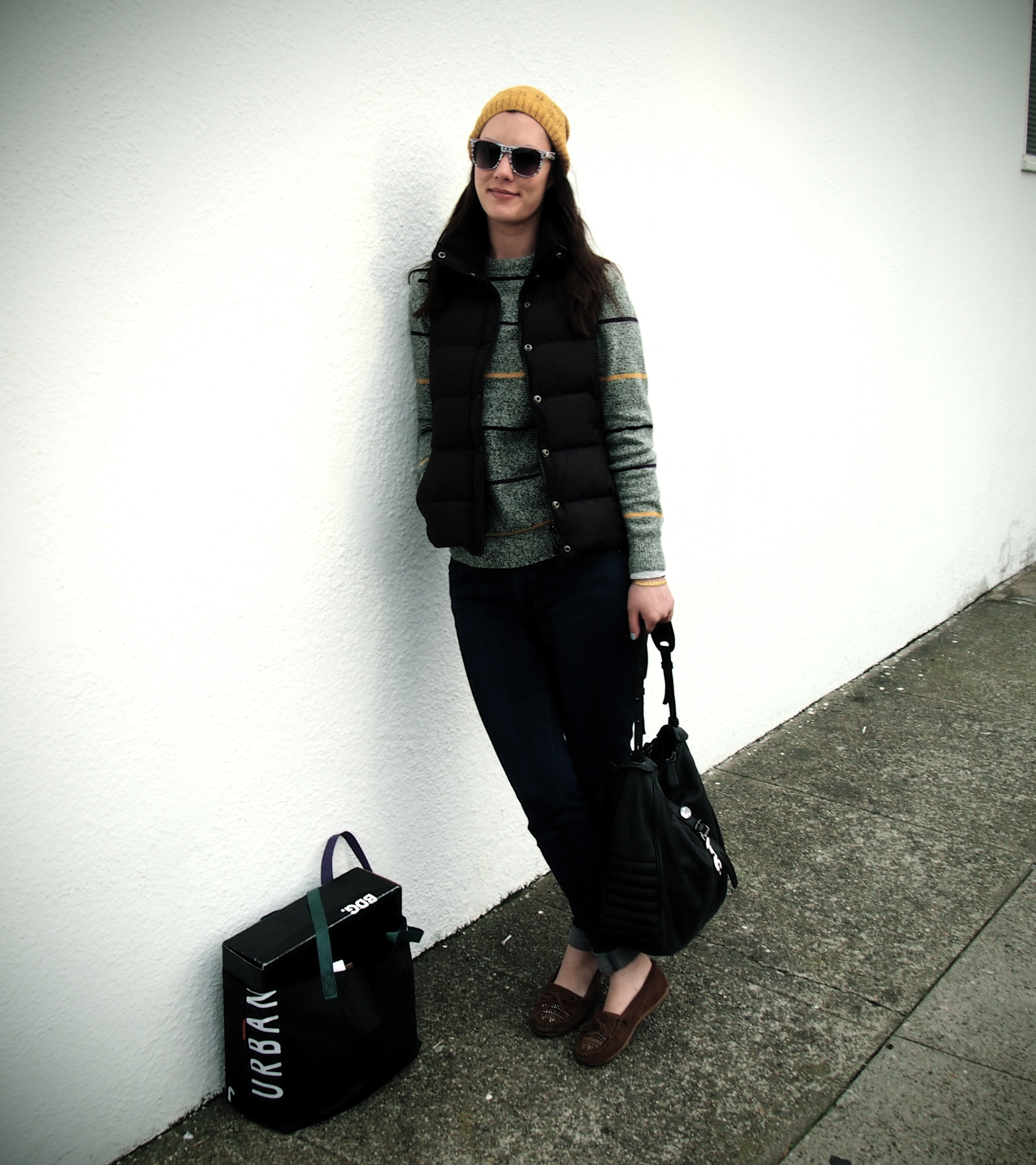 beanie and sunnies: F21 – sweater: UO men’s dept. – puffy vest and bag: J.Crew – jeans: Uniqlo – shoes: minetonka via UO