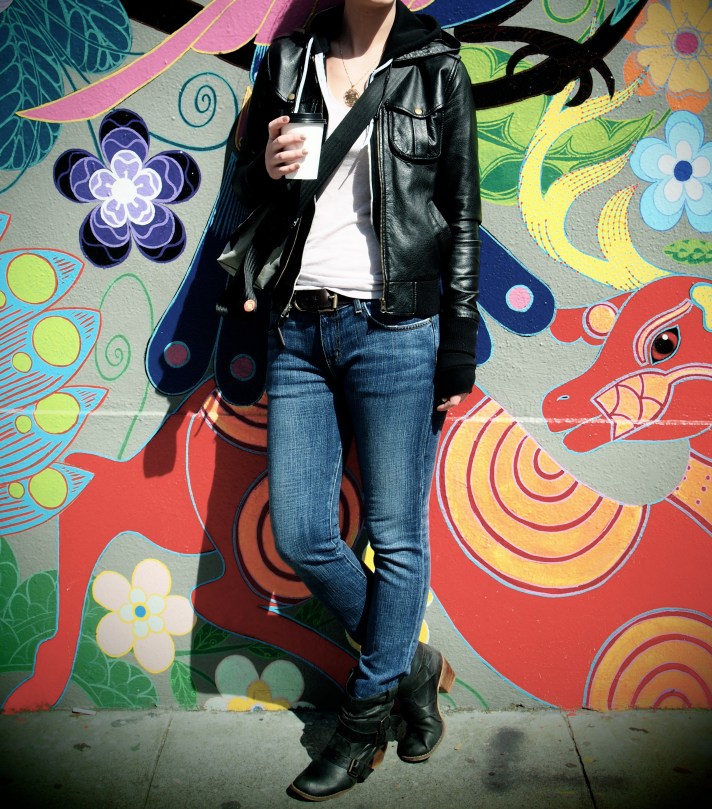 rx sunnies: bonlook – jacket: old urban outfitters – hoodie: american apparel – t shirt: threads for thought via nordstrom rack – belt: old gap – jeans: current elliot – my most favorite old old booties ever: BP by nordstrom – bag: freitag – necklace: family heirloom