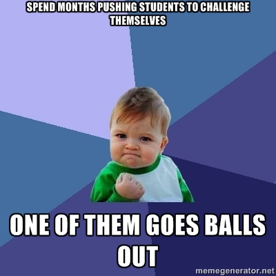 My class, as good as they are, kept encouraging her with “Don’t worry C__, you don’t have to be shy in front of us” and “you can do it C___, just pretend we’re not here at all” and other supportive things.  Still didn’t help.  She was still standing there frozen with large eyes.  I suggested that everyone in the class turn around so that C_____ wouldn’t feel like all the eyes were on her, every single student whipped around in their seats and stared at the wall.  After a 3 minutes of tortured silence, C____ began to speak, read her note cards and did her presentation, switching slides for the backs of heads.  It was a mini victory.  I wanted to hug each one of my 5th period students that day and stick them all in my pocket so that I could pull them out routinely and tell them how proud they make me.
