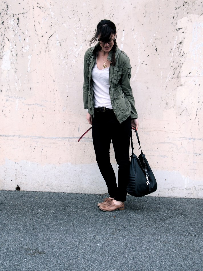 glasses: warby parker – jacket: h&m (old) – v-neck: thread for thought via nordstrom rack – belt: gap – jeans: uniqlo – shoes: bass – bag: j.crew