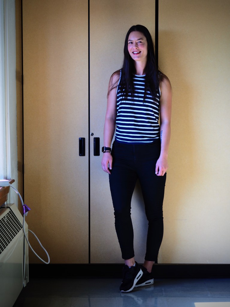 earrings: a sara boeck original – tank: madewell – pants: everlane – shoes: mohinders – watch: fitbit