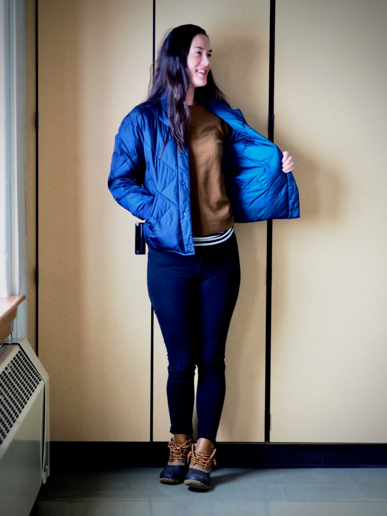 I really liked this day’s outfit. I had pinned this picture long ago on Pinterest and finally got around to recreating it. I’ve had these items in my closet for a while now, so the new star of the show is a Uniqlo reversible bomber jacket. I saw it on a mannequin while in the shop this past weekend and spent a ridiculous amount of time trying to find it on the women’s floor. Turns out, it was a men’s item. I wear men’s clothes all the time, so I tried on the XS (I normally wear a small or medium at Uniqlo depending on the item), and into the shopping bag it went. I need another jacket like I need a hole in my head, but that day I bought two more because I’m a sucker without any self control. The jacket is reversible, y’all. It’s like a two for one! There is currently a women’s version as a puffer, but I preferred the colors and the bomber style of the men’s. I instantly felt like a super cool sailor man when I paired it with a beanie (later at the brewery) and stripes.