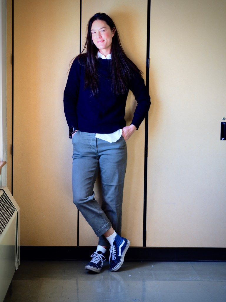 These pants though, are a new favorite. They are basically fancy sweats and so damn comfortable while looking interesting and polished at the same time. It’s no secret that I love somewhat weird architectural cuts and that I love Uniqlo. So the Uniqlo U line is perfect for me. These pants look really weird styled by Uniqlo, but when I tried them on, they looked normal, just a bit “interesting”. I texted a photo to my friend Melissa and she said I could pull them off, so straight to the register it was. B thought they were weird and cartoony. I actually love how they remind me of Popeye the sailor man with the exaggerated cartoony legs. The kids also approved. One girl that morning: “Miss, i like your pants.” “Thanks! My husband said they look like cartoon pants.” *scoffs* “Miss, you can do better!” *shakes her head* “cartoon pants…” *scoffs*