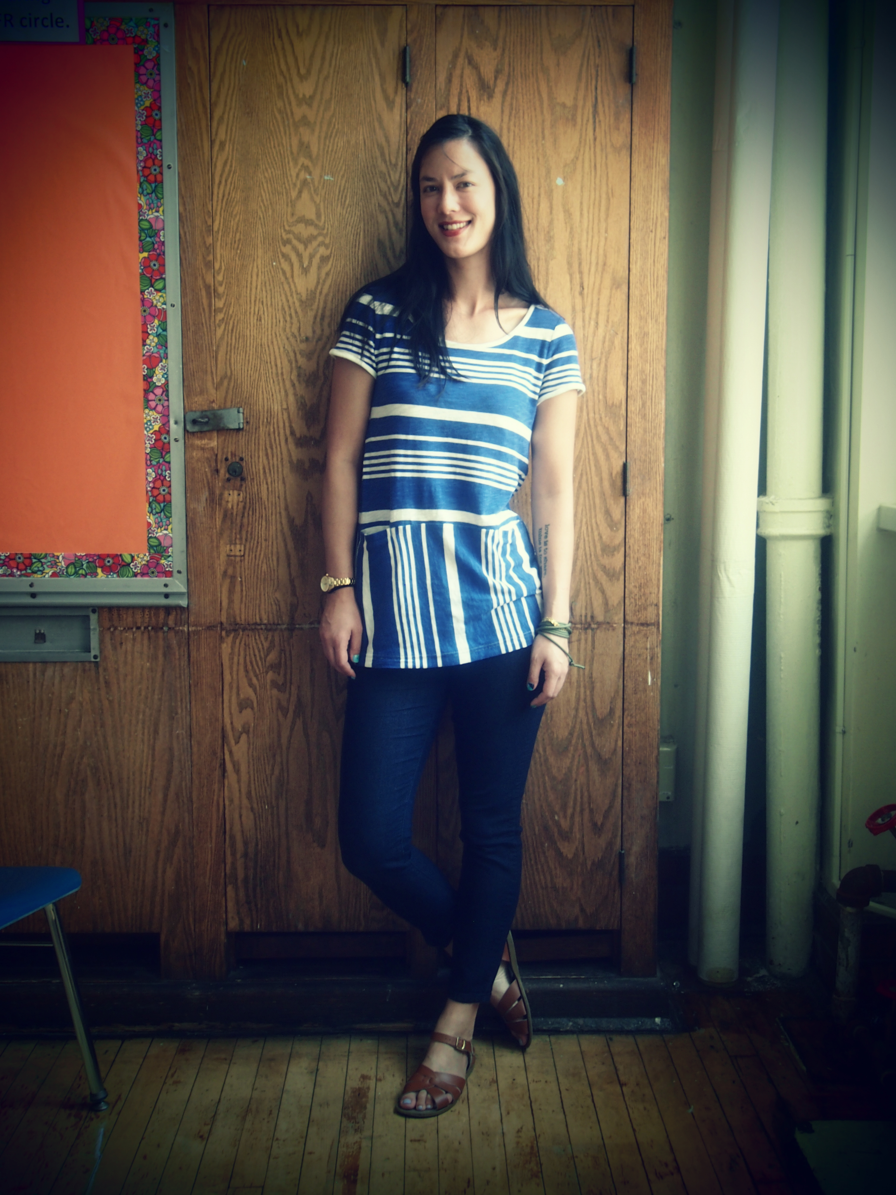 Rachel is the teacher spotlight this week! I’ve always loved Rachel’s look – I’m pretty sure we shop at similar places. Chances are good that if I’ve been debating on buying a particular dress or pair of shoes, Rachel will walk in to the staff room with that exact item on! I’m actually pretty surprised we haven’t inadvertently “twins-ied” yet. I loved Rachel’s jumper (as in playsuit, not sweater) today and was secretly envious that she could pull it off so well. One pieces never work for me since my height is all in the torso (not comfortable at all!) One day, I’ going to sew one for myself – extra long in the crotch. In the meantime, I can stare at Rachel’s and it’s awesome print.