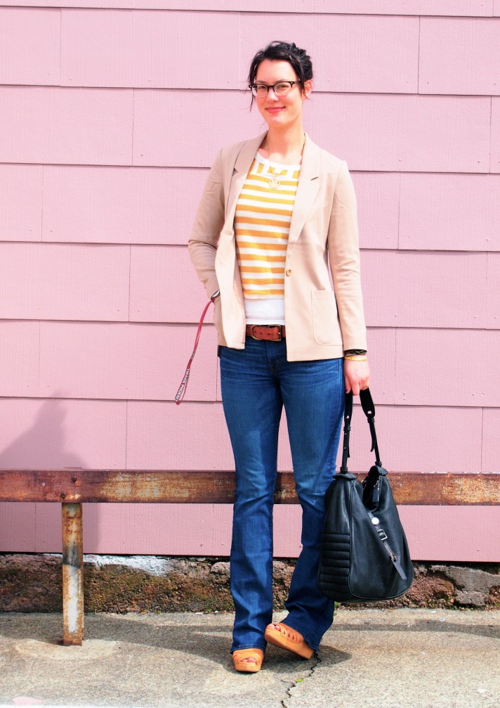 glasses: bonlook – blazer: F21 – sweater: madewell – tank (underneath): target – belt: banana republic (old) – jeans: j.brand – shoes: h&m – bag: jcrew