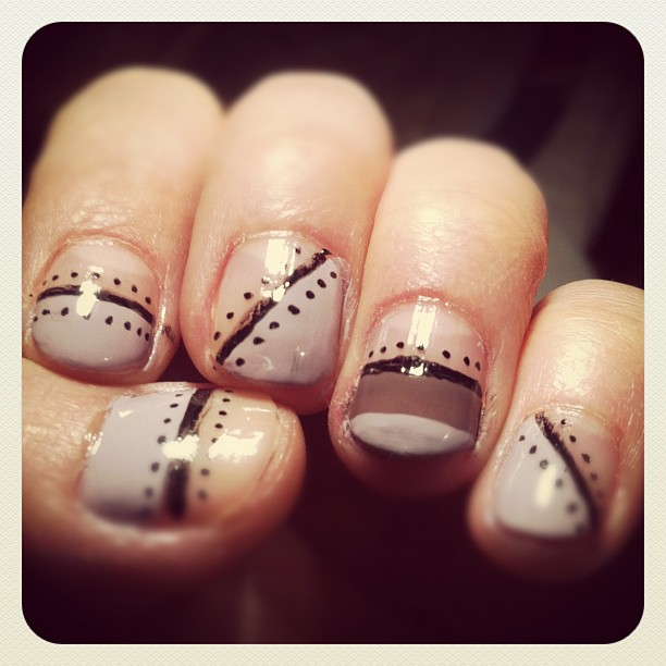 This week, I went more geometric. B bought me a 3 month subscription to Birchbox, and january’s box came with this lavender Zoya polish. It’s pretty enough, but I’m not a fan of the brush or the viscosity.