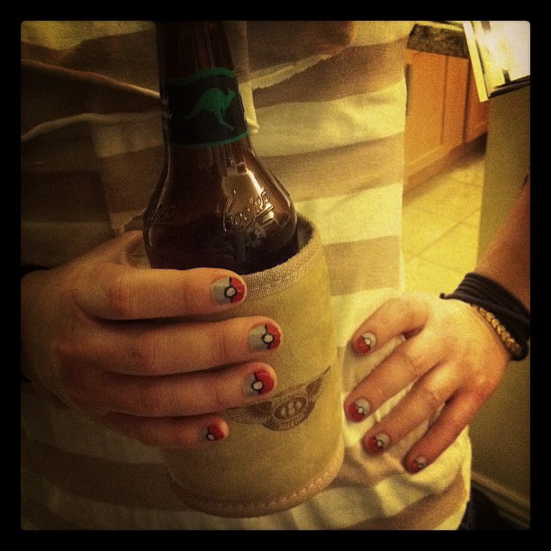 This design took a while but was pretty simple in the end. Full grey nails, covered half way with red. Then add a white dot and outline with black sharpie marker (or sally hansen nail polish pens). By the way, this photo was taken on Australia Day where B (the aussie) and I celebrated with Coopers Pale Ale and special edition sheepskin stubbie holders by Aussie Bentley.