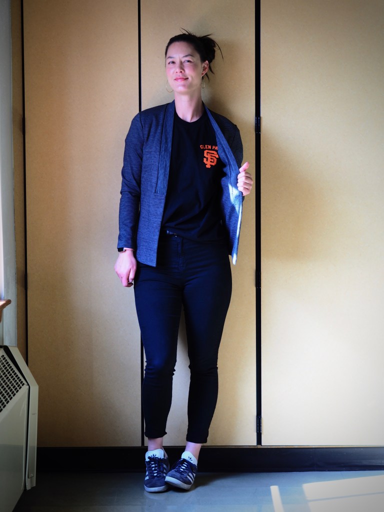 I have very fond memories of the neighborhood, and have watched it change slowly over the last 38 years. Whenever I walk through the streets of Glen Park, I’m always reminded of something from when I was a kid – my elementary school has been running since 1938, the same coffee shop is on the corner, the trees are all still the same, and I still see many of the same faces around. This last trip coincided with the annual Glen Park Festival, which meant live music and a number of vendors were out selling things like jewelry and t-shirts. The moment I spied a Glen Park-Giants shirt, I had to snap one up even though the only size left was a men’s large! I’m heading to the Giants vs. Rockies game tomorrow, so I’m representing starting today! I smarted up the t-shirt for work with a stretchy ath-leisure style blazer and hoop earrings. All together a really easy outfit to throw together for a work day.