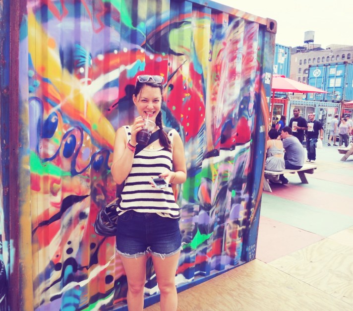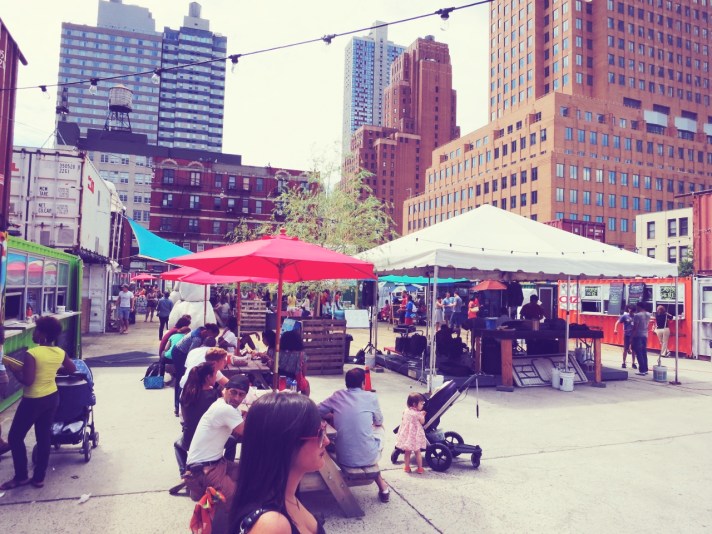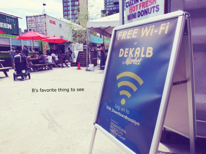B and I rode our bikes over to Dekalb Market today. The weather has cooled a bit and I’m getting used to riding my single-speed (no more jello legs). I know I need to stop comparing NY to SF, but the Dekalb market is a larger version of the Proxy Project in Hayes Valley. It’s pretty cool and I love the design sensibilities of a “mall” out of old shipping containers. Salvaged materials, an urban farm, artisanal foods, an Etsy pop-up with a vintage tool shop and you’ve got yourself a thriving hipster mecca. We overheard some dude with an epic beard lamenting the presence of a jump-house and screaming kids–> “there should be an adults only hour or something if they’re going to make this cool”. Like B says, at least they’re in a cage. I really wanted to buy a bike basket/Bambi holder from this shop (seriously cute stuff), but alas, the weight limit is 12lbs. Bambi is a fatty.