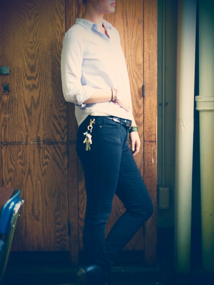 shirt: madewell – belt: j.crew – jeans: bdg – socks: juicy couture (gift from my sister years ago) – boots: steve madden – necklace: my popo via mommy