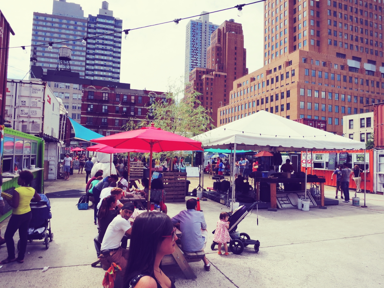 B and I rode our bikes over to Dekalb Market today. The weather has cooled a bit and I’m getting used to riding my single-speed (no more jello legs). I know I need to stop comparing NY to SF, but the Dekalb market is a larger version of the Proxy Project in Hayes Valley. It’s pretty cool and I love the design sensibilities of a “mall” out of old shipping containers. Salvaged materials, an urban farm, artisanal foods, an Etsy pop-up with a vintage tool shop and you’ve got yourself a thriving hipster mecca. We overheard some dude with an epic beard lamenting the presence of a jump-house and screaming kids–> “there should be an adults only hour or something if they’re going to make this cool”. Like B says, at least they’re in a cage. I really wanted to buy a bike basket/Bambi holder from this shop (seriously cute stuff), but alas, the weight limit is 12lbs. Bambi is a fatty.