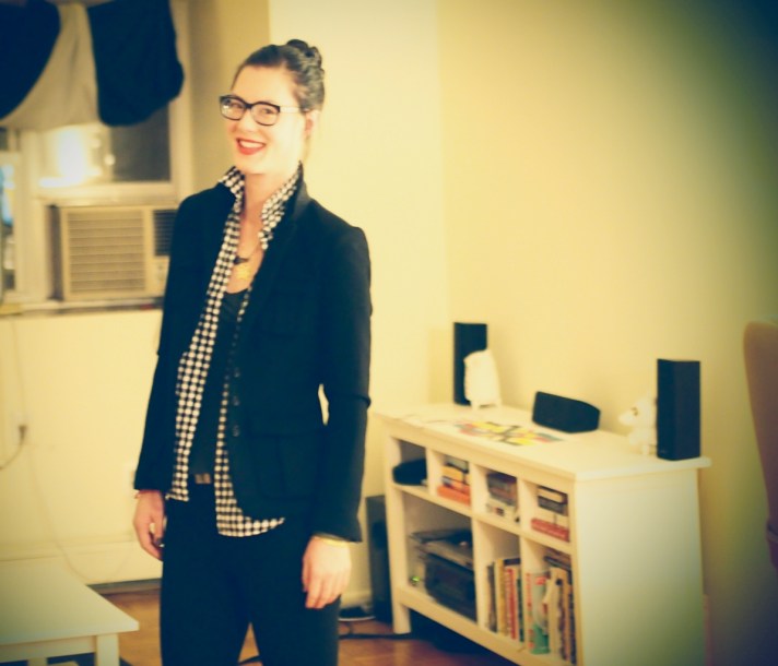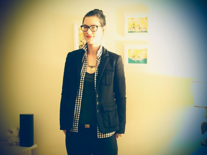 glasses: warby parker – sweater: urban outfitters – belt: gap – skirt: thrifted (no tag and I suspect it was a server’s uniform skirt at one time) – boots: zara